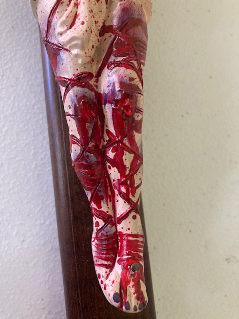 These crucifixes are hand cast, individually detailed, then kiln fired and hand painted. They are then nailed to a walnut-stained maple wood cross and stabilized with permanent glue. The Agonizing Christ design has bruising, scourging, and wounds imbedded into the corpus that you can feel. This allows the person praying to meditate on the Passion of Jesus as fully as possible. Each cross is 14 1/2" tall by 10" wide, and comes ready to hang on your wall.
